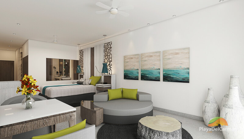These luxurious suites include provide spectacular views of the Caribbean Sea and come equipped with chic interiors, a a round sofa for two that swivels 360 degrees to enjoy the sunlight coming through the glass sliding door, and the comfort of being able to swim directly up to the gourmet corner and swim up bar.
